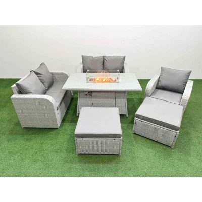 General description This Fimous High Back Poly Rattan Garden Furniture Set is designed for both indoor and outdoor use, featuring a reclining chair, loveseat sofa, firepit dining table, and two big stools. The set combines comfort and style with its light grey rattan and dark grey fabric, making it a perfect addition to your patio or garden. Technical specifications Reclining chair dimensions: 74W x 69D x 79H cm Loveseat sofa dimensions: 124W x 67D x 79H cm Big footstool dimensions: 65L x 65W x 34H cm Firepit dining table dimensions: 140L x 80W x 69H cm Sofa weight capacity: 250 kg Table weight capacity: 80 kg Seat cushion thickness: 8 cm Material: Flat PE rattan, galvanized steel tube frames with powder coating Glass top: 5 mm thick transparent tempered glass Installation Items come flat packed and are easy to assemble. Usage Adjustable reclining chairs with a back inclination range of 90°-130°. For safety, place the gas fire pit on the glass top and not underneath it. Ensure the gas