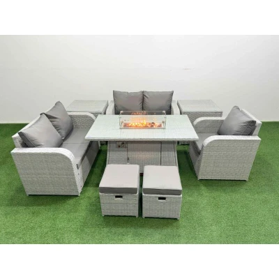 General description This Fimous High Back Poly Rattan Garden Furniture Set is designed for both indoor and outdoor use, featuring a reclining chair, loveseat sofa, firepit dining table, two stools, and two side tables. The set is crafted from light grey rattan with dark grey fabric, providing a stylish and comfortable seating solution for your patio or garden. Technical specifications Reclining chair dimensions: 74W x 69D x 79H cm Loveseat sofa dimensions: 124W x 67D x 79H cm Stool dimensions: 40W x 40D x 34H cm (2 stools included) Side table dimensions: 65L x 65W x 66H cm (2 side tables included) Firepit dining table dimensions: 140L x 80W x 69H cm Sofa weight capacity: 250 kg Table weight capacity: 80 kg Seat cushion thickness: 8 cm Material: PE rattan, galvanized steel tube frames with powder coating Glass top: 5 mm thick transparent tempered glass Installation Items come flat packed and are easy to assemble. Usage Adjustable reclining chairs with a back inclination range of