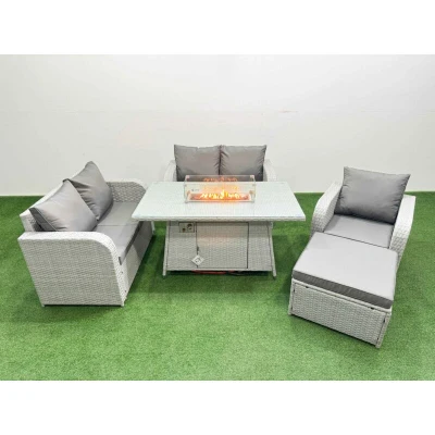 General description This Fimous High Back Poly Rattan Garden Furniture Set is designed for both indoor and outdoor use, featuring a reclining chair, loveseat sofa, firepit dining table, and a big stool. The set is crafted with light grey rattan and dark grey fabric, providing a stylish and comfortable seating option for your patio or garden. Technical specifications Reclining chair dimensions: 74W x 69D x 79H cm Loveseat sofa dimensions: 124W x 67D x 79H cm Big footstool dimensions: 65L x 65W x 34H cm Firepit dining table dimensions: 140L x 80W x 69H cm Sofa weight capacity: 250 kg Table weight capacity: 80 kg Seat cushion thickness: 8 cm Material: PE rattan, galvanized steel tube frame with powder coating Glass top: 5 mm thick tempered glass Installation Items come flat packed and are easy to assemble. Usage Adjustable reclining chairs with a back inclination range of 90°-130°. Recommended to use a 5 kg gas tank for the fire pit. Check for gas leaks at the joints and hose before use.