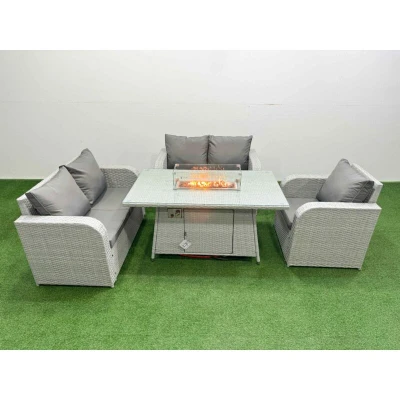 General description This Fimous High Back Poly Rattan Garden Furniture Set is designed for both indoor and outdoor use, featuring a reclining chair, loveseat sofa, and a firepit dining table. The set is crafted from light grey rattan with dark grey fabric, providing a stylish and comfortable seating option for your patio or garden. Technical specifications Reclining chair dimensions: 74W x 69D x 79H cm Loveseat sofa dimensions: 124W x 67D x 79H cm (2 pieces) Firepit dining table dimensions: 140L x 80W x 69H cm Sofa weight capacity: 250 kg Table weight capacity: 80 kg Seat cushion thickness: 8 cm Material: PE rattan, galvanized steel tube frames with powder coating Glass top: 5 mm thick transparent tempered glass Installation Items come flat packed and are easy to assemble. Usage Adjustable reclining chairs with inclination from 90° to 130°. Recommended to use a 5 kg gas tank for the fire pit. Check for gas leaks at the joints and hose before use. Keep cushions indoors or use a rain