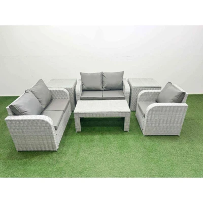 General description This deluxe 6-piece rattan sofa set is a great addition to your patio or garden, made of high-quality PE rattan and durable galvanized steel. The set includes reclining chairs, a loveseat sofa, an oblong coffee table, and two side tables, all designed for both indoor and outdoor use. Technical specifications Reclining chair dimensions: 74W x 69D x 79H cm Loveseat dimensions: 124W x 67D x 79H cm Side table dimensions: 65L x 65W x 66H cm Coffee table dimensions: 105L x 50W x 48H cm Sofa weight capacity: 250 kg Table weight capacity: 80 kg Color: Light grey rattan with dark grey fabric Installation Items come flat packed and are easy to assemble. Includes sturdy galvanized steel tube metal frames with powder coating to prevent rust. Usage The two armchairs are adjustable, allowing you to change the inclination of the chair back from 90° to 130°. Low maintenance with removable cushion covers. Recommended to keep cushions indoors or use a rain cover when not in use.