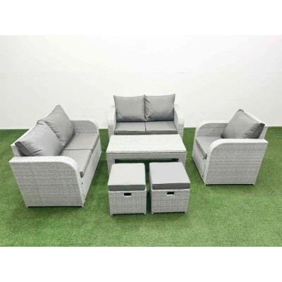 General description This deluxe PE rattan sofa set is a great addition to your patio or garden, made of high-quality PE rattan and durable galvanized steel. The set includes reclining chairs, a loveseat sofa, an oblong coffee table, and two stools, all designed for comfort and style. Technical specifications Reclining chair dimensions: 74W x 69D x 79H cm Loveseat sofa dimensions: 124W x 67D x 79H cm Stool dimensions: 40W x 40D x 34H cm Table dimensions: 105L x 50W x 48H cm Sofa weight capacity: 250 kg Table weight capacity: 80 kg Seat cushion thickness: 8 cm Glass thickness: 5 mm (tempered) Installation Items come flat packed and are easy to assemble. Usage Adjustable reclining chairs with a back inclination range of 90°-130°. Low maintenance with removable cushion covers. Recommended to keep cushions indoors or use a rain cover when not in use. Other information Light grey rattan with dark grey fabric; color may vary due to lighting or monitor settings. Factory direct sale guarantees