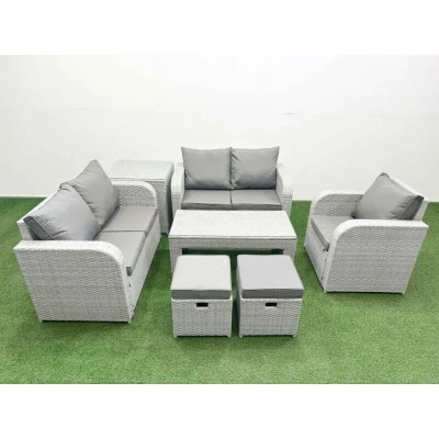 General description This deluxe PE rattan sofa set is a great addition to your patio or garden, made of high-quality PE rattan and durable galvanized steel. The set includes reclining chairs, a loveseat sofa, stools, and a coffee table, all designed for comfort and style. Technical specifications Reclining chair dimensions: 74W x 69D x 79H cm Loveseat sofa dimensions: 124W x 67D x 79H cm Stool dimensions: 40W x 40D x 34H cm Side table dimensions: 65L x 65W x 66H cm Coffee table dimensions: 105L x 50W x 48H cm Sofa weight capacity: 250 kg Table weight capacity: 80 kg Color: Light grey rattan with dark grey fabric Installation Items come flat packed and are easy to assemble. Usage Adjustable armchairs with a reclining feature (90°-130°). Low maintenance with removable cushion covers. Recommended to keep cushions indoors or covered when not in use. Other information 5mm thick transparent tempered glass with suckers on the surface to prevent sliding. 8 cm thick seat cushion with soft back