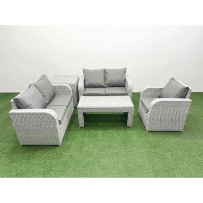 General description This deluxe 5-piece rattan sofa set is a perfect addition to your patio or garden, crafted from high-quality PE rattan and durable galvanized steel. The set includes reclining chairs and a loveseat sofa, providing both comfort and style for indoor and outdoor use. Technical specifications Reclining chair dimensions: 74W x 69D x 79H cm Loveseat sofa dimensions: 124W x 67D x 79H cm Side table dimensions: 65L x 65W x 66H cm Table dimensions: 105L x 50W x 48H cm Sofa weight capacity: 250 kg Table weight capacity: 80 kg Seat cushion thickness: 8 cm Material: PE rattan, galvanized steel frame, 5mm thick tempered glass Installation Items come flat packed and are easy to assemble. Includes sturdy galvanized steel tube metal frames with powder coating to prevent rust. Usage Adjustable reclining chairs with an inclination range of 90°-130°. Low maintenance with removable cushion covers. Recommended to keep cushions indoors or use a rain cover when not in use. Other