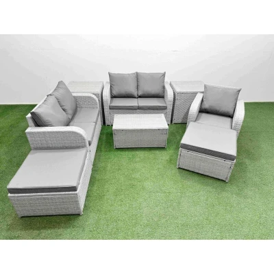 General description This deluxe PE rattan sofa set is an excellent addition to your patio or garden, crafted from high-quality PE rattan and durable galvanized steel. The set includes a reclining chair, loveseat sofa, a rectangular coffee table, two big stools, and two side tables, all designed for both indoor and outdoor use. Technical specifications Reclining chair dimensions: 74W x 69D x 79H cm Loveseat sofa dimensions: 124W x 67D x 79H cm Big footstool dimensions: 65L x 65W x 34H cm Side table dimensions: 65L x 65W x 66H cm Coffee table dimensions: 85L x 50W x 37H cm Sofa weight capacity: 250 kg Table weight capacity: 80 kg Color: Light grey rattan with dark grey fabric Installation Items come flat packed and are easy to assemble. Sturdy galvanized steel tube metal frames with powder coating to prevent rust. Usage Adjustable armchairs with a reclining back that can be set from 90° to 130°. Low maintenance with removable cushion covers. Recommended to keep cushions indoors or use a