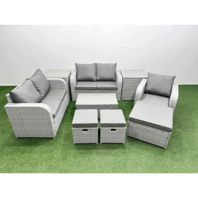 General description This deluxe PE rattan sofa set is a great addition to your patio or garden, made of high-quality PE rattan and durable galvanized steel. The set includes a reclining chair, loveseat sofa, a rectangular coffee table, three stools, and two side tables, all designed for both indoor and outdoor use. Technical specifications Reclining chair dimensions: 74W x 69D x 79H cm Loveseat sofa dimensions: 124W x 67D x 79H cm Big footstool dimensions: 65L x 65W x 34H cm Stool dimensions: 40W x 40D x 34H cm (2 units) Side table dimensions: 65L x 65W x 66H cm (2 units) Coffee table dimensions: 85L x 50W x 37H cm Sofa weight capacity: 250 kg Table weight capacity: 80 kg Color: Light grey rattan with dark grey fabric Installation Items come flat packed and are easy to assemble. Sturdy galvanized steel tube metal frames with powder coating to prevent rust. Usage Adjustable armchairs with a back inclination range from 90° to 130°. Low maintenance with removable cushion covers.