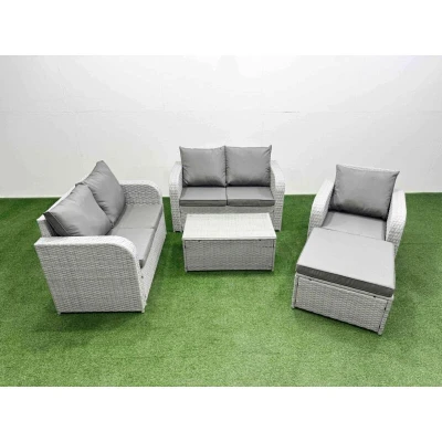 General description This deluxe PE rattan sofa set is a great addition to your patio or garden, made of high-quality PE rattan and durable galvanized steel. The set includes a reclining chair, loveseat sofa, a rectangular coffee table, and a big stool, all designed for comfort and style. Technical specifications Reclining chair dimensions: 74W x 69D x 79H cm Loveseat dimensions: 124W x 67D x 79H cm (2 pieces) Big footstool dimensions: 65L x 65W x 34H cm Table dimensions: 85L x 50W x 37H cm Sofa weight capacity: 250 kg Table weight capacity: 80 kg Color: Light grey rattan with dark grey fabric Seat cushion thickness: 8 cm Glass thickness: 5 mm (tempered glass) Installation Items come flat packed and are easy to assemble. The sturdy galvanized steel tube metal frames are powder-coated to prevent rust. Usage The two armchairs are adjustable, allowing you to change the inclination of the chair back from 90° to 130° using a button. The set is low maintenance, with removable cushion covers