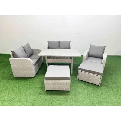 General description This deluxe PE rattan sofa set is a great addition to your patio or garden, made of high-quality PE rattan and durable galvanized steel. The set includes reclining chairs, a loveseat sofa, a rectangular dining table, and two big stools, all designed for both indoor and outdoor use. Technical specifications Reclining chair dimensions: 74W x 69D x 79H cm Loveseat dimensions: 124W x 67D x 79H cm Big footstool dimensions: 65L x 65W x 34H cm Dining table dimensions: 140L x 80W x 68H cm Sofa weight capacity: 250 kg Table weight capacity: 80 kg Material: Light grey rattan with dark grey fabric Seat cushion thickness: 8 cm Glass thickness: 5 mm tempered glass Installation Items come flat packed and are easy to assemble. Includes sturdy galvanized steel tube metal frames with powder coating to prevent rust. Usage The two armchairs are adjustable, allowing you to change the inclination of the chair back from 90° to 130°. Low maintenance with removable cushion covers.