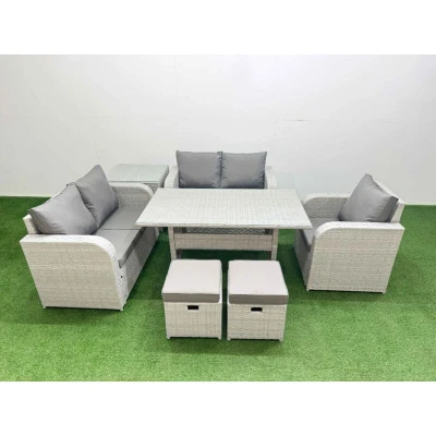 General description This deluxe PE rattan sofa set is a great addition to your patio or garden, made of high-quality PE rattan and durable galvanized steel. The set includes reclining chairs, a loveseat sofa, a rectangular dining table, and stools, providing both comfort and style for indoor and outdoor use. Technical specifications Reclining chair dimensions: 74W x 69D x 79H cm Loveseat sofa dimensions: 124W x 67D x 79H cm Stool dimensions: 40W x 40D x 34H cm (2 stools included) Side table dimensions: 65L x 65W x 66H cm Dining table dimensions: 140L x 80W x 68H cm Sofa weight capacity: 250 kg Table weight capacity: 80 kg Color: Light grey rattan with dark grey fabric Installation Items come flat packed and are easy to assemble. Sturdy galvanized steel tube metal frames with powder coating to prevent rust. Usage Adjustable armchairs with a reclining back that can be set from 90° to 130°. Low maintenance with removable cushion covers. Recommended to keep cushions indoors or use a rain