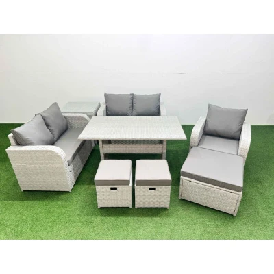 General description This deluxe PE rattan sofa set is a great addition to your patio or garden, made of high-quality PE rattan and durable galvanized steel. The set includes a reclining chair, loveseat sofa, a rectangular dining table, and stools, providing both comfort and style for indoor and outdoor use. Technical specifications Reclining chair dimensions: 74W x 69D x 79H cm Loveseat dimensions: 124W x 67D x 79H cm Big footstool dimensions: 65L x 65W x 34H cm Stool dimensions: 40W x 40D x 34H cm (2 units) Side table dimensions: 65L x 65W x 66H cm Dining table dimensions: 140L x 80W x 68H cm Sofa weight capacity: 250 kg Table weight capacity: 80 kg Color: Light grey rattan with dark grey fabric Installation Items come flat packed and are easy to assemble. Usage Adjustable armchairs with a reclining feature from 90° to 130°. Low maintenance with removable cushion covers. Recommended to keep cushions indoors or use a rain cover when not in use. Other information 5mm thick transparent