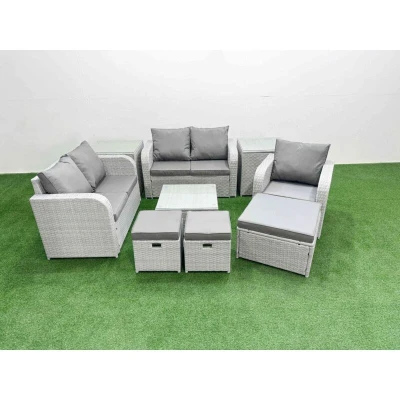 General description This deluxe PE rattan sofa set is a great addition to your patio or garden, made of high-quality PE rattan and durable galvanized steel. The set includes reclining chairs, a loveseat sofa, stools, and side tables, providing both comfort and style for indoor and outdoor use. Technical specifications Reclining chair dimensions: 74W x 69D x 79H cm Loveseat dimensions: 124W x 67D x 79H cm Big footstool dimensions: 65L x 65W x 34H cm Stool dimensions: 40W x 40D x 34H cm (2 units) Side table dimensions: 65L x 65W x 66H cm (2 units) Table dimensions: 65L x 65W x 34H cm Sofa weight capacity: 250 kg Table weight capacity: 80 kg Color: Light grey rattan with dark grey fabric Installation Items come flat packed and are easy to assemble. Usage Adjustable armchairs with a reclining back that can be set from 90° to 130°. Low maintenance with removable cushion covers. Recommended to keep cushions indoors or use a rain cover when not in use. Other information 5mm thick transparent