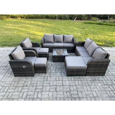 General description This outdoor garden furniture sofa set provides ample seating for up to 11 people. It includes a tempered glass coffee table, making it an ideal addition to your patio, garden, backyard, pool, and other indoor and outdoor spaces. Technical specifications Big footstool dimensions: 65L x 65W x 34H cm Small footstool dimensions (2 pieces): 40L x 40W x 34H cm Reclining chair dimensions (2 pieces): 74L x 67W x 79H cm 3-seater sofa dimensions (2 pieces): 177W x 67D x 79H cm Square coffee table dimensions: 65L x 65W x 34H cm Material: Dark grey mixed rattan with dark grey fabric Seat cushion thickness: 8 cm Installation Items come flat packed and are easy to assemble. Includes sturdy galvanized steel tube metal frames with powder coating to prevent rust. Usage Adjustable armchairs with a back inclination range of 90°-130°. Removable cushion covers for easy maintenance. Recommended to keep cushions indoors or use a rain cover when not in use. Use a rain cover for the