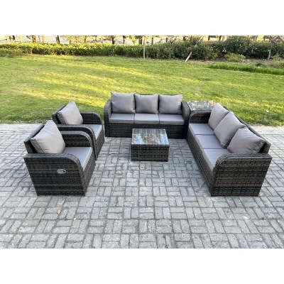 General description This outdoor garden furniture sofa set provides ample seating for up to 10 people, featuring a tempered glass coffee table ideal for holding food, drinks, and more. It is a perfect addition to your patio, garden, backyard, pool, and other indoor and outdoor spaces. Technical specifications Set Dimensions: 1 x Side Coffee Table: 65L x 65W x 66H cm 2 x Reclining Chairs: 74L x 67W x 79H cm 2 x 3-Seater Sofas: 177W x 67D x 79H cm 1 x Square Coffee Table: 65L x 65W x 34H cm Material: Dark grey mixed rattan with dark grey fabric Seat Cushion Thickness: 8 cm Installation Items come flat packed and are easy to assemble. Includes sturdy galvanized steel tube metal frames with powder coating to prevent rust. Usage The armchairs are adjustable, allowing you to change the backrest inclination from 90° to 130°. Removable cushion covers for easy maintenance. Keep cushions indoors or use a rain cover when not in use. Use a rain cover to protect the furniture if not in use for an