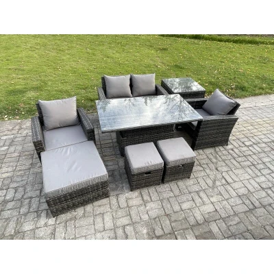 High Back Rattan Garden Furniture Sofa Sets with Height Adjustable Rising Lifting Table Side 3 Footstools Dark Grey Mixed Fimous