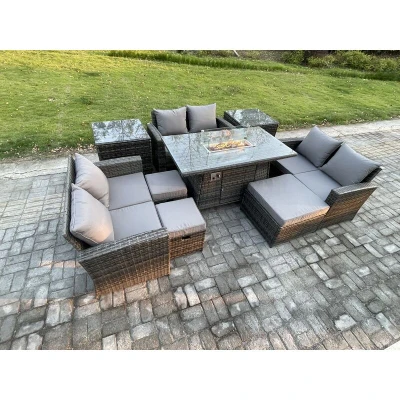 High Back Rattan Garden Furniture Sofa Sets with Outdoor Gas Firepit Dining Table Set 3 Footstools 2 Side Tables Dark Grey Mixed Fimous