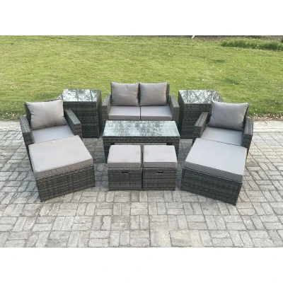 High Back Rattan Garden Furniture Sofa Sets with Rectangular Coffee Table 2 Side Tables Armchair Big Footstool Small Footstools Dark Grey Mixed