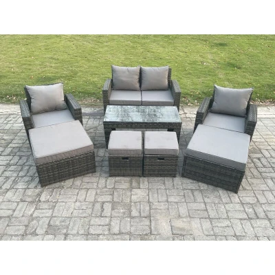 High Back Rattan Garden Furniture Sofa Sets with Rectangular Coffee Table Armchair 2 Big Footstool Small Footstools Dark Grey Mixed Fimous