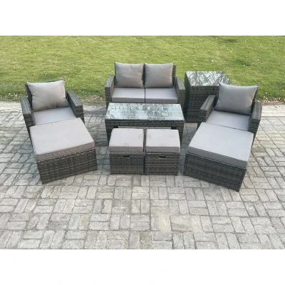 High Back Rattan Garden Furniture Sofa Sets with Rectangular Coffee Table Side Armchair 2 Big Footstool Small Footstools Dark Grey Mixed