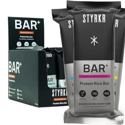 High Protein Energy Bars by Styrkr 15g of & 45g Carbs Pack 12 Rice Raspberry White Chocolate Flavour Approved Endurance Athletes for Cycling Running BAR+ 12x