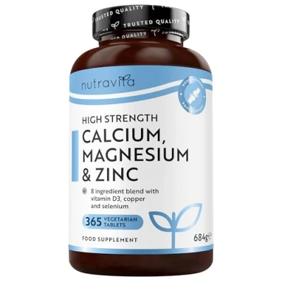 High Strength Supplement – Each daily serving (2 tablets) of our supplement contains Calcium 800mg (400mg per tablet), Magnesium 360mg (180mg per tablet), Zinc 5mg (2.5mg per tablet) & Vitamin D3 1000iu (500iu per tablet). Blended with Copper, Manganese, Selenium & Boron for added benefits. Our supplement provides a 6 month supply (365 vegetarian tablets). To ensure you receive 100% of your daily Calcium NRV (recommended daily intake), we have split the serving over 2 tabs. PACKAGING MAY VARY. Why Take Calcium, Magnesium, Zinc & Vitamin D? - Calcium, Magnesium and Zinc are three important minerals for the body, which combined with Vitamin D are crucial in the maintenance of normal bones & teeth, immune system, normal muscle function, and reduction of tiredness & fatigue. Claims substantiated by EFSA (European Food Safety Authority). Not all benefits are guaranteed, for best effects our supplements should be taken regularly over a longer period of time alongside a healthy lifestyle. How to Take Our Supplement - For the most effective results, we recommend taking 2 tablets per day, covering at least 100% of your Calcium Daily NRV. The 22mm x 10mm oval tablets have been designed to be taken with water, a meal, healthy smoothie or shake. If you find the tablets large, you can crush the tablet and sprinkle over food to ingest. For more recommendations on taking this supplement, please do get in touch with our team and we will endeavour to help you! Formulated by Nutritionists: Nutravita's products are developed with a team of in-house nutritionists to deliver trusted, effective formulations. We include ingredients with proven benefits to support your wellbeing every day. We are here for your daily support for a wide range of health goals. What is The Story Behind Nutravita? - Nutravita is a recognised and trusted Vitamins & Supplements brand providing thousands of customers across the world for over 6 years. Our high quality products are manufactured, batch tested and certified in the UK, and safeguarded by the highest manufacturing standards in the world (GMP, BRC). We have a dedicated team of pharmacologists, chemists and research scientists working to source the finest and most beneficial ingredients.