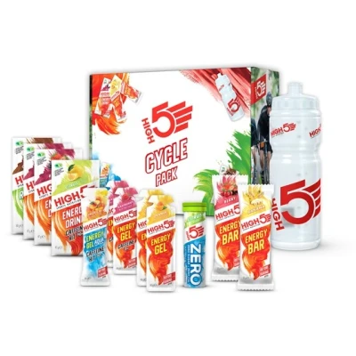 The HIGH5 Cycle Pack has everything you need for any cycling training session or event. Each pack contains:Key Features: 2x Energy Gel 2x Energy Gel Caffeine 1x Energy Gel Aqua Caffeine 2x Energy Drink sachet 1x Energy Drink Caffeine Hit sachet 1x Recovery Drink sachet 2x Energy Bar 1x ZERO Citrus 10 tab tube 1x 750ml Bottle The HIGH5 Cycle Pack is a selection of cyclists’ favourite products. Whether you are new to sports nutrition or stocking up for a training sessions or an event, this pack is full of all your nutrition essentials. This pack is suitable for vegetarians and contains an assortment of bestselling flavours. Please consider the environment and keep the countryside clean by taking your empty wrappers with you after use.