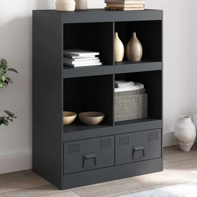 ManoManoGeneral description This stylish highboard adds an elegant charm to your existing interior. It features ample storage space for keeping your magazines, books, remote controls, and other small items well-organized and within reach. Technical specifications Colour: Anthracite Material: Cold-rolled steel Dimensions: 67 x 39 x 95 cm (W x D x H) Maximum load capacity: 76 kg With 4 shelves With 2 drawers With 2 metal handles Assembly required: Yes Usage Easy to maintain: The highboard can be cleaned with a damp cloth and requires minimal maintenance. Practical handle: The sideboard comes with 2 handles that make it easy to open and close the cabinet while also enhancing its aesthetic appeal. Other information Warning: To prevent it from tipping over, this product must be used with the wall attachment device (not provided).