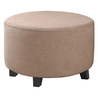 Highdi Ottoman Cover Round, Stretch Jacquard Fabric Footstool Slipcover, Solid Color Stool Protector with Elastic Bottom, Dustproof Removable Washable Footrest Pouffe Covers (Khaki,S)