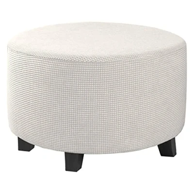 Highdi Ottoman Cover Round, Stretch Jacquard Fabric Footstool Slipcover, Solid Color Stool Protector with Elastic Bottom, Dustproof Removable Washable Footrest Pouffe Covers (White,L)