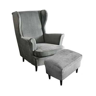 Highdi Velvet Wingback Chair Covers 2 Piece with Ottoman Cover, Stretch Wing Slipcover, Washable Spandex Fabric Sofa Cover Furniture Protector for Armchair Chairs Bedroom Hotel (grey)