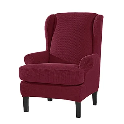 Highdi Wingback Chair Covers 2 Piece Stretch Wing Slipcover, Solid Color Jacquard Washable Spandex Fabric Sofa Cover Furniture Protector for Armchair Chairs Living Room Bedroom Hotel (Burgundy)