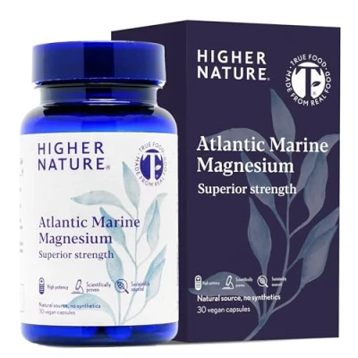 HIGH STRENGTH 100% NATURAL SOURCED MAGNESIUM: Our nutritionist formulated high strength magnesium capsules contain 300mg per capsule. This scientifically backed magnesium supplement is nature made from filtered Atlantic seawater, is gentle on the gut and easily absorbed. This 30 capsule, one month supply is ideal for those that suffer from muscle tension, low energy or find it hard to relax in the evening. ONE-A-DAY ENERGY SUPPORT: Magnesium supplements for women and men help support the normal nervous system, psychological function and can be taken to help improve energy levels, reduce tiredness and fight fatigue. Often referred to as "nature's relaxant", magnesium capsules and tablets can aid a restful night, improve sleep, calm, support muscle and leg cramps. ESSENTIAL FOR OVER 300 BODY PROCESSES: This essential mineral is responsible for over 300 processes in the body and studies suggest that foods may contain up to 40% less magnesium than they did 80 years ago. Increasing magnesium intake from supplementation becomes more important. Our Atlantic Marine Magnesium advanced supplement is a new & improved formula of our previous bestselling Super Magnesium, which now contains no additives, no synthetics, scientific strength and 100% natural. NATURAL MAGNESIUM: High strength natural magnesium is sourced from the Irish Sea and can be better tolerated than other types of magnesium. Naturally contains beneficial trace minerals which researchers have found to help the magnesium to be better absorbed. The suggested intake is 1 capsule per day. Suitable for adults and children over 13 years. TRUE FOOD DIFFERENCE: Higher Nature's True Food formulations are made from only real food, using green extraction techniques providing honest nutrients, exactly as they are grown in nature. 100% natural actives, zero synthetics. THIRD-PARTY TESTED: For guaranteed quality and purity, this product has been third-party tested so you can be confident it meets our highest standard. NUTRITIONIST FORMULATED: Pioneering therapeutic, nature-led formulas for over 30 years, Higher Nature is a renowned British supplement brand you can trust in. Every expertly crafted, science-driven formula delivers nutrients certified to the highest quality standards for superior benefits. Each bottle contains 30 Capsules | One Month Supply | 30 Servings | Vegetarian & Vegan Please note box may not be supplied