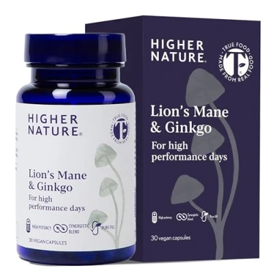 Higher Nature Lion's Mane & Ginkgo for High Performance Days Strength Biloba 6000mg Mushroom 3000mg Vegan Formula 30 Capsules