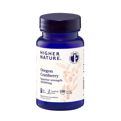 100% Premium Oregon Cranberries Higher Nature's brand new Oregon Cranberry delivers scientifically proven strengths of unique A-type proanthocyanidins (A-PACs) in every capsule. These naturally potent compounds help keep pathogenic bacteria at bay to support urinary tract health and comfort so you can continue to thrive. Why Oregon? The world's most potent cranberries Higher Nature sourced premium, hand-harvested cranberries from Oregon, as the unique climate around this coastline results in the most powerful cranberries in the world. Growing conditions here result in double the strength of the key compounds responsible for their benefits. An ancient and traditionally used superfood, cranberries are a powerhouse of over 150 potent beneficial compounds which offer anti-microbial protection as well as protection from oxidative stress to help rein in inflammation at the cellular level. This makes them perfect to help protect and nourish your glow from within as cranberry's antioxidant superpowers help neutralise unstable molecules that can drive skin cell damage and fuel premature aging. What are cranberry A-PACs? Cranberries are the only natural source of a specific flavanol (plant compound) known as A-type proanthocyanidins (A-PACs) which are responsible for cranberry's naturally powerful support in urinary tract health. These special compounds help prevent pathogenic bacteria from attaching to your body, meaning they can be more easily flushed out when you stay hydrated. As this doesn't kill the bacteria, there is less chance of antibiotic resistance, just nature's intelligence working in perfect harmony. The True Food® Difference * 100% natural source, no synthetics or additives * Unparalleled potency; minimum 48,000mg per capsule * Gold standard, patented Cranberex® * Scientifically proven strength 36mg A-PACs per capsule * Over 1.4kg fresh whole cranberries in every pot * Nutritionist formulated * Third party tested for guaranteed quality and purity