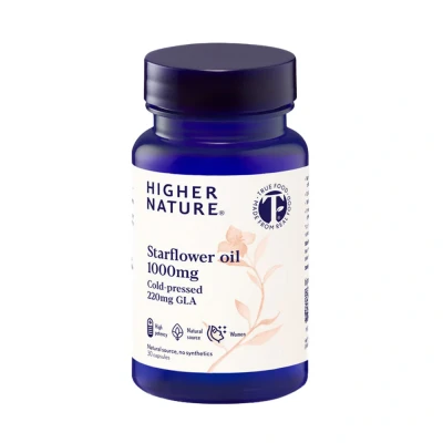 Hormone Harmony Starflower oil has a rich history of use rooted in ancient herbal medicine, best known for balancing mood, hormones and skin. As nature's most potent source of omega fatty acid GLA (gamma linolenic acid) starflower oil is a superior choice to Evening Primrose oil as it is twice as rich in this beneficial fatty acid. Recommended by NHS doctors and hospital trusts as a natural approach to help ease challenging monthly symptoms such as breast pain. Your body converts GLA into prostaglandins; these biological messengers are anti-inflammatory, influencing hormones, the immune system and metabolism. Radiant Skin With few good food sources of GLA in the diet, starflower oil helps bridge a key nutrient gap and has proven skin health benefits. Higher Nature high potency capsules offer 1000mg starflower oil with 220mg GLA per capsule. Starflower oil's omega fatty acids nourish your skin from within by aiding skin cell structure and function, helping to keep inflammation in check and encouraging hydration. Helping to help fight premature ageing and promote soft, glowing skin. The True Food® Difference * 100% natural source, no synthetics * Cold-pressed for maximum nutritional integrity * Free from pyrrolizidine alkaloids * Scientific strength * Nutritionist formulated * NHS doctor recommended * Third party tested for quality assurance