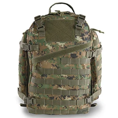 Constructed of heavy weight durable polyester Large main compartment with laptop / water bladder pocket Extensive MOLLE webbing platform Top center hydration tube access point 2 spacious side pockets