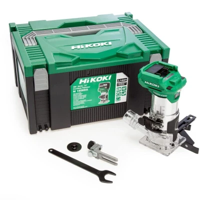 General description The HiKOKI M1808DA/J2Z/18 1/4" Cordless Router Trimmer is designed for both professional and DIY enthusiasts, offering the flexibility of cordless operation combined with the power and speed of corded tools. Its compact and lightweight design ensures ease of use, while the exceptional high-performance motor delivers impressive cutting speeds. The trimmer features variable speed control, an easy access ON/OFF switch, and a safety switch operation for enhanced user safety. Technical specifications Collet size: 6.35mm (1/4") No-load speed: 10,000 - 30,000/min Base mounting diameter: 64.8mm Dimensions: 109 x 100 x 229mm Weight (including battery): 1.7kg Main Body Stroke: 40mm Battery Voltage: 18V Collet Cone Capacity: 6mm and 8mm (or 1/4") Compatibility and accessories 1/4" Collet Cone Trimmer Guide Set Template Guide Dust Collection Adapter Set 23mm Wrench Carrying Case Installation Quick release lever for base adjustment with rack-and-pinion micro adjustment system