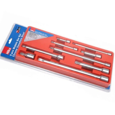 General description Professional Tools Chrome vanadium steel fully heat treated with satin chrome finish. The Wobble Plus design features a curved head that allows for a 7-degree tilt angle of movement, making it ideal for tight, hard-to-reach areas. It can also be fixed in a straight position for normal use. The set includes a spring-loaded ball bearing for secure fitment. Technical specifications Material: Chrome vanadium steel Finish: Satin chrome Wobble angle: 7 degrees Drive sizes: 3 x 1/2"" drive (2"", 5"", 10""), 3 x 3/8"" drive (3"", 6"", 9""), 3 x 1/4"" drive (2"", 4"", 6"") Other information Supplied in tool tray