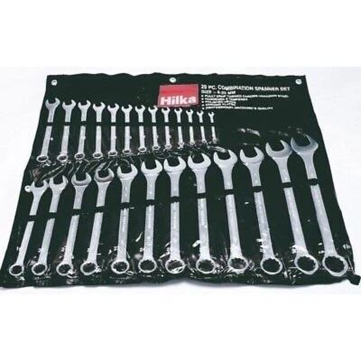 General description Hilka Spanner Set includes 25 pieces of chrome combination wrenches, designed for professional use. The wrenches are made from chrome vanadium steel, which is correctly hardened and tempered for durability. Each wrench features polished jaws and is chrome plated for added protection against corrosion. Technical specifications Material: Chrome vanadium steel Sizes: 6, 7, 8, 9, 10, 11, 12, 13, 14, 15, 16, 17, 18, 20, 21, 22, 23, 24, 25, 26, 27, 28, 30, 32 mm Other information Includes a vinyl storage wallet for easy organization Packed in a roll-up wallet and display box 1 Year Warranty
