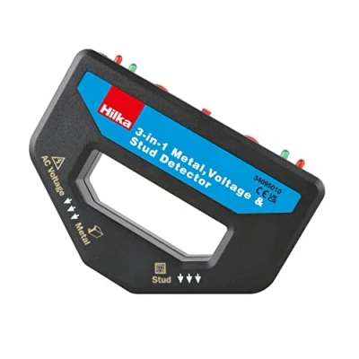 3-in-1 combined unit that detects live electricity cables, metal pipes for water or gas, as well as wooden studs and battens, displaying a red or green LED light and emitting an audible signal., Manufacturer: HILKATOOLS