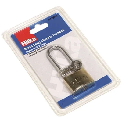 40mm Brass long shackle padlock, solid brass rust and corrosion resistant fully hardened shackle., Manufacturer: Hilka