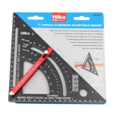 Quick and accurate way to mark angles and guides on materials Adjustable locking arm with hip / valley and com / jack angle guide. Made from solid aluminium with easy to read laser etched graduations. Great for making consistent repetitive cuts. Functions as a try square, 90° & 45° mitre square, 1/3 rafter square, protractor, ruler and line guide., Manufacturer: Hilka Tools