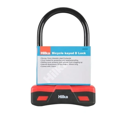 Heavy duty 12mm, vinyl coated, steel D-shackle for extra security. Lock with sliding cover and 2 keys. Vinyl coating protects your bike from scuffing and weatherproofs the lock. Sliding cover protects lock cylinder from clogging up. Internal dimensions 107mm wide x 185mm long, Weight: 1.81219979364 Pounds, Manufacturer: Hilka Tools