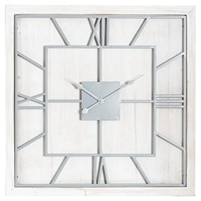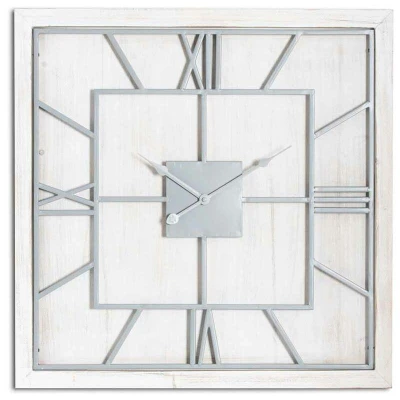 General description An eye-catching square wall clock comprised of a wooden base overlaid with a roman numeral clock face in a contrasting light grey metal. This timepiece will fit with a variety of decor schemes, and the light grey metal roman numerals stand out against its white washed wood surround. Technical specifications Length: 5 cm Height: 90 cm Width: 90 cm Weight: 7.59 kg CBM: 0.0400 Colour: silver, white Material: metal, wood Battery: 1 x AA (not included) Installation Supplied with a hook for wall mounting already attached to the frame, making it simple to hang. Usage Add 1 x AA battery to start the clock mechanism.
