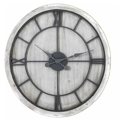 General description An eye-catching round wall clock featuring a wooden base with a roman numeral clock face in contrasting light grey metal. This stylish timepiece complements a variety of decor schemes, with the light grey metal numerals standing out against the white washed wood surround. Technical specifications Length: 5 cm Height: 60 cm Width: 60 cm Weight: 2.95 kg CBM: 0.0500 Colour: silver, white Material: metal, wood Battery: 1 x AA (not included) Installation Supplied with a hook for wall mounting already attached to the frame, making it simple to hang. Usage Add 1 x AA battery to start the clock mechanism.
