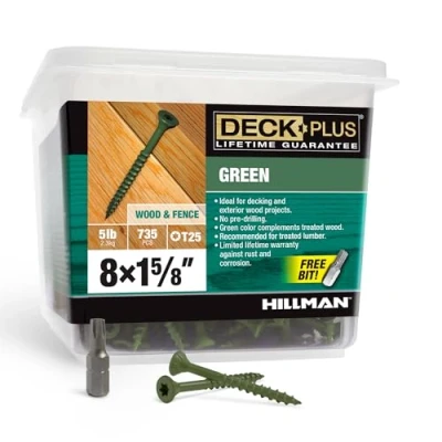 Self-Drilling Point: Together, coarse screw threads and a self-drilling point design eliminate the need for a pilot hole Epoxy Coating: Screws feature a 4-layer epoxy coating for enhanced corrosion resistance, making them ideal for use in pressure-treated wood and outdoor decking, as they prevent staining and ensure long-lasting durability Star Drive Style: Also known as Torx, this drive provides 6 contact points and is designed to reduce slippage and cam-out when tightening the screw T25 Star Bit: T25 driver bit included in package matches screws and takes the guesswork out of installation Specifications: 735 pieces, #8 x 1-5/8" Deck Screws, 5lb Box T-25 Star/Torx Drive Bit included; Screws come in a convenient and easy-to-use package designed to keep your space organized and clutter-free, Weight: 0.01 Pounds, Manufacturer: The Hillman Group