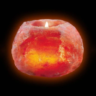 Salt crystal tealight holder for an atmospheric ambience Natural crystal salt from Punjab, south of the Himalayas, has been turned into a tealight holder with a finely crafted hole. The candlelight spreads a warm, cosy light thanks to the orange tone of the salt stone, creating an atmospheric ambience. The salt crystal tealight holder is ideal for creating a small oasis of wellness and well-being. Each salt lamp is unique and can therefore vary in height and diameter.