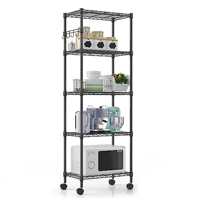 100% Metal; 59W x 35D x 183H cm; Max Load 350kg ✅ VERSATILE HOME STORAGE SOLUTION: Premium 5-tier metal wire shelving unit with compact footprint, perfect for kitchens, bathrooms, garages, balconies, and living spaces. Efficiently organises tools, kitchenware, clothing, toiletries, and household essentials in any room. ✅ HEAVY-DUTY CONSTRUCTION: This storage shelf crafted from premium carbon steel with superior corrosion resistance and easy-clean surfaces. Robust engineering supports up to 350kg total capacity, ensuring reliable long-term performance. ✅ MAXIMUM STORAGE CAPACITY: Five spacious wire shelves provide extensive storage whilst maintaining excellent airflow. Additional side hooks offer bonus hanging space for utensils or accessories, maximising organisation without expanding floor footprint. ✅ EFFORTLESS MOBILITY & ASSEMBLY: Standing shelf rack features smooth-rolling lockable castors for easy repositioning when needed. Tool-free assembly system with clear instructions ensures quick 15-minute setup - no screwdrivers or complicated hardware required. ✅ CUSTOMISABLE SHELF CONFIGURATION: Fully adjustable shelf heights accommodate items from small storage boxes to tall appliances. Create your personalised storage solution with precise 1-inch incremental adjustments to suit your specific organisational needs.