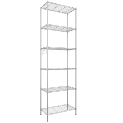 Sturdy and Permanent - The 6-tier shelf is made of high-strength steel and finished in high-gloss chrome, has excellent rust and corrosion resistance. High resilience, good toughness, strong shock resistance, the 6-Shelf Wire Shelving Units holds up to 220 lbs / 100 kg. Your kitchen will stand out in a neat environment. Large Space - With the size of 62.99" H X 11.42" W X 21.26"L, the 6-tier shelf has the 6-tier design and 1 side suspension can easily contribute to a clean kitchen. The grid shelf between the levels is adjustable, you can put microwave, Rice cooker, juicer, etc on the shelf. The hook of the side hanger can chop knives, pans, gargle, towels as you like. Multi-Functional - The Wire Shelving stand is easy to move. Customize any place where you need to make a clean kitchen, create a minimalist living room, keep the bedroom clean, storage toiletries, you can even use it as a balcony flower stand. Safe Storage - The poles periodically have double grooves to ensure that you have all the clips at the same height. The adjustable leveling feet ensure that the shelf stays at the same height, also with a safety fence design to prevent goods from slipping onto the floor. Easy Assembly - The organization frame of the 6-tier shelf is simple, easy to assemble, easy to disassemble and assemble and does not require any tools.