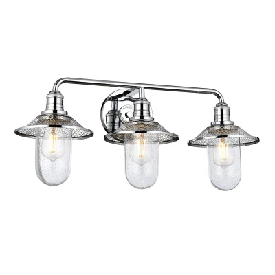 Rigby is inspired by the American barn light, reborn as a chic interior retro classic. Features such as cast socket covers, mesh shades and canopy details combine the best in both vintage and industrial design elements. Available in a two-tone finish of Antique Nickel and Heritage Brass or Polished Chrome. With clear seeded glass lamp protectors, these Rigby models are suitable for use in bathrooms.
