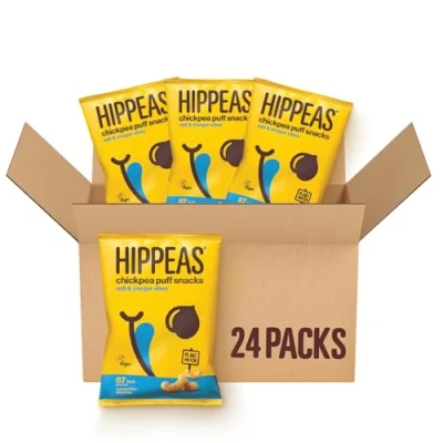 HIPPEAS Salt & Vinegar Chickpea Puff Vegan Crisps 24 x 22g Snack Bags Plant Based, Source of Protein Fibre Free from Gluten Artificial Flavours Light Crunchy 91 calories per serving